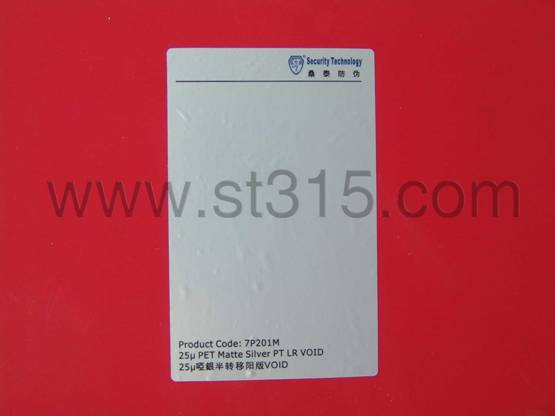 桑泰7P201M防偽材料被揭起后,會有銀色實體的“VOID”字樣(3MM高*11MM寬)轉(zhuǎn)移到承貼物表面,同時鏤空的“VOID”也會顯現(xiàn)在標(biāo)簽面材上,不可復(fù)原,以示已開啟。有效地阻嚇盜竊、竄貨等不法行為的肆行。