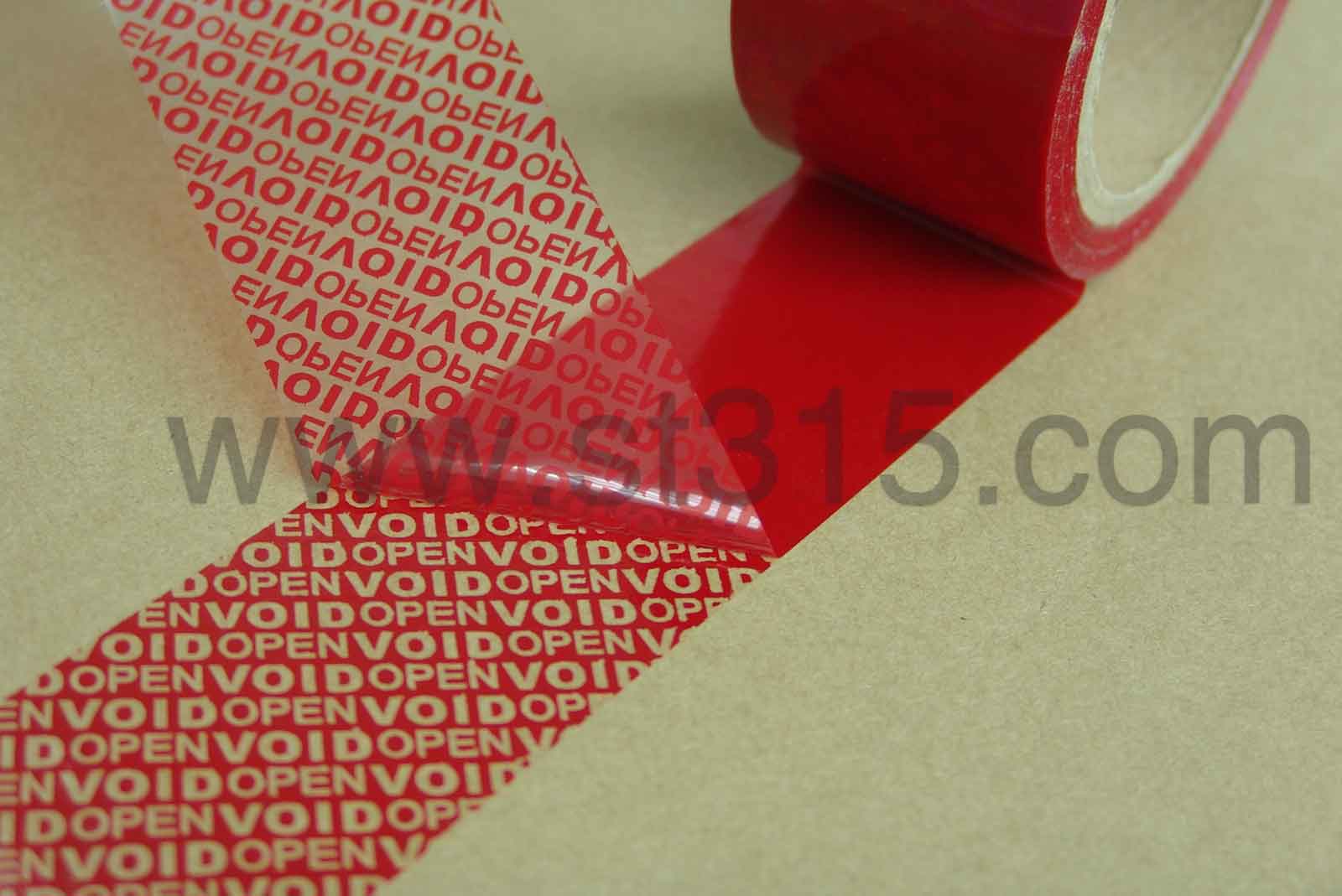 桑泰8H209T防偽膠帶為紅色,主要用于封箱。 揭起后,會有紅色鏤空的“VOIDOPEN”字樣(5MM高*33.5MM寬)轉移到箱體表面,同時“VOIDOPEN”實體也會呈現在膠帶面材上,不可復原,以示已開啟。有效地阻嚇盜竊、竄貨等不法行為的肆行。