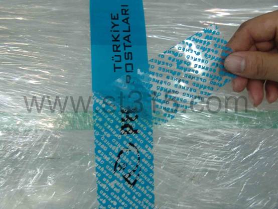 桑泰9T2108T為藍色全轉移型防偽膠帶。 揭起后,會有藍色鏤空的“OPENED”字樣轉移到箱體表面,同時也呈現在膠帶面材上,不可復原,以示已開啟。有效地阻嚇盜竊、竄貨等不法行為的肆行。